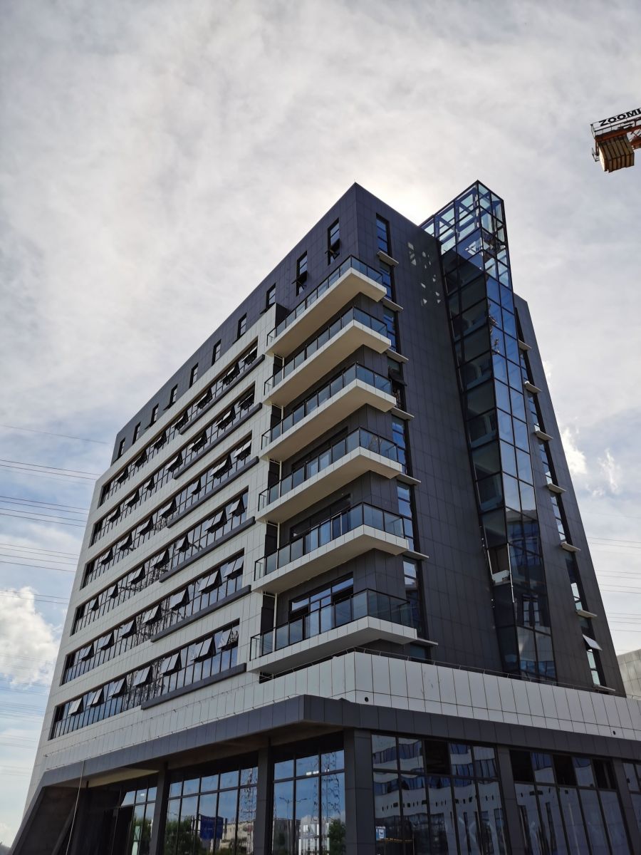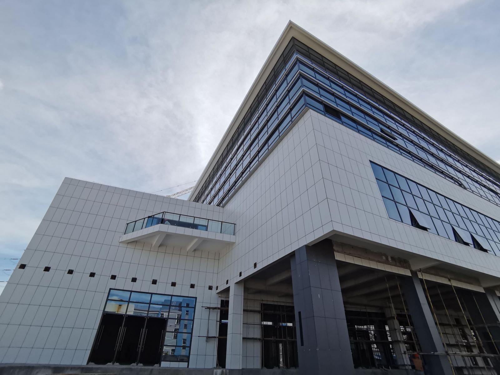 整棟建筑外立面使用白色、灰色陶瓷薄板鋪貼裝飾。