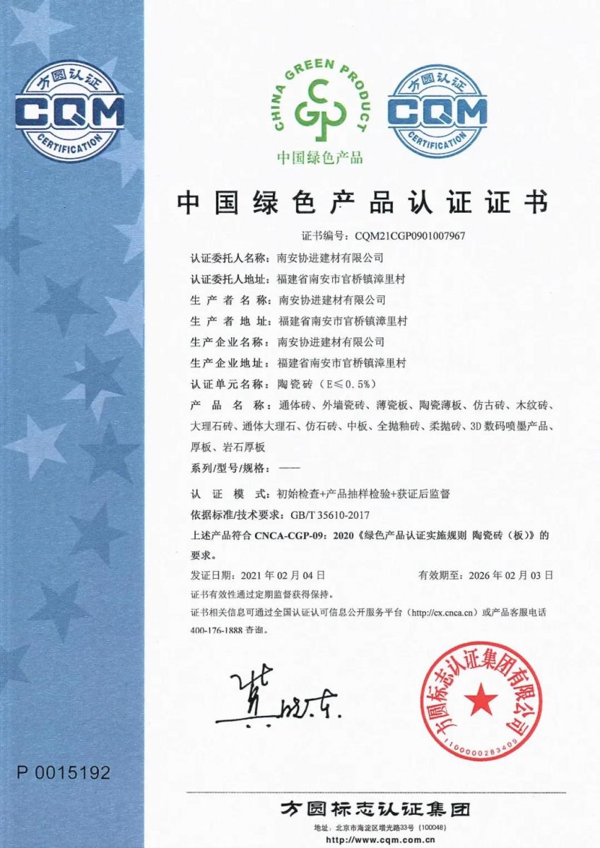 憑借持續(xù)踐行“綠色、節(jié)能、環(huán)保”的發(fā)展理念通過“中國(guó)綠色產(chǎn)品”認(rèn)證。是對(duì)2012年獲評(píng)“全國(guó)節(jié)能先進(jìn)集體”、2017年通過“三星級(jí)綠色建材評(píng)價(jià)標(biāo)識(shí)”認(rèn)證后的鼓勵(lì)和再次肯定。協(xié)進(jìn)陶瓷將繼續(xù)與社會(huì)各界一同攜手構(gòu)建低碳環(huán)保建筑體系,為實(shí)現(xiàn)企業(yè)與社會(huì)的可持續(xù)發(fā)展繼續(xù)努力。