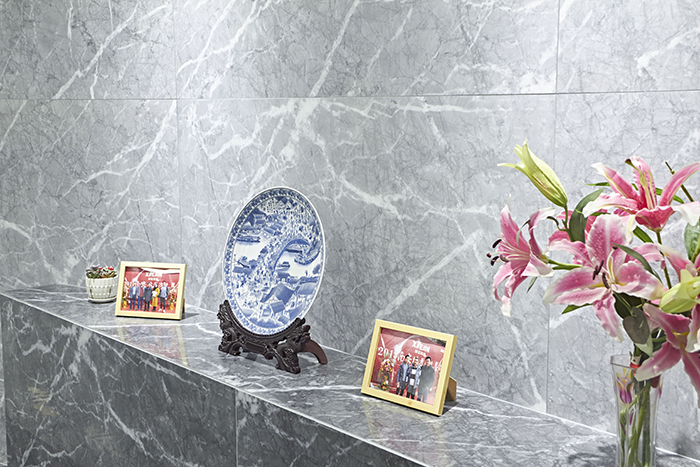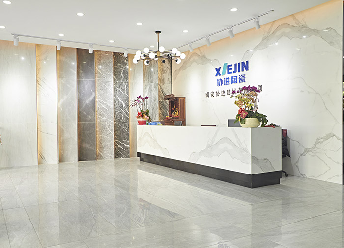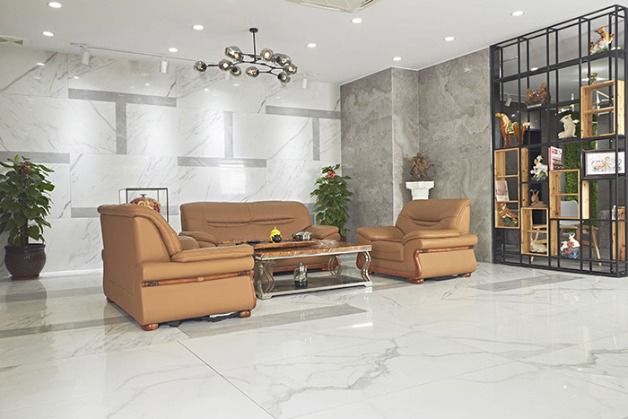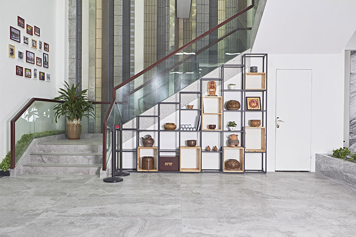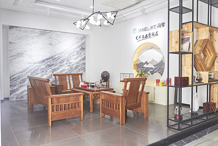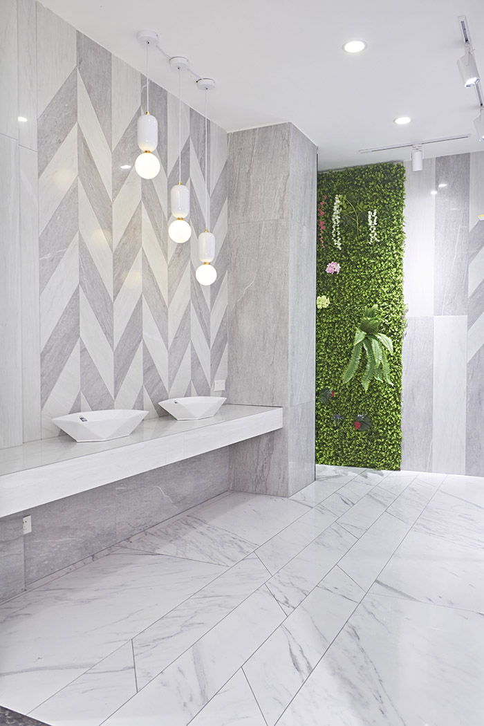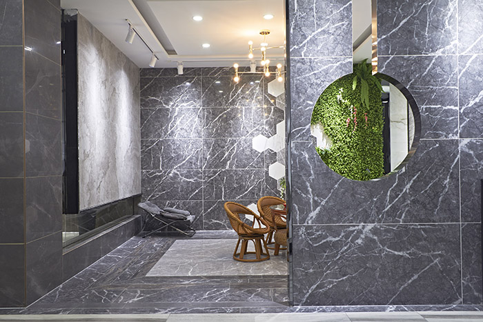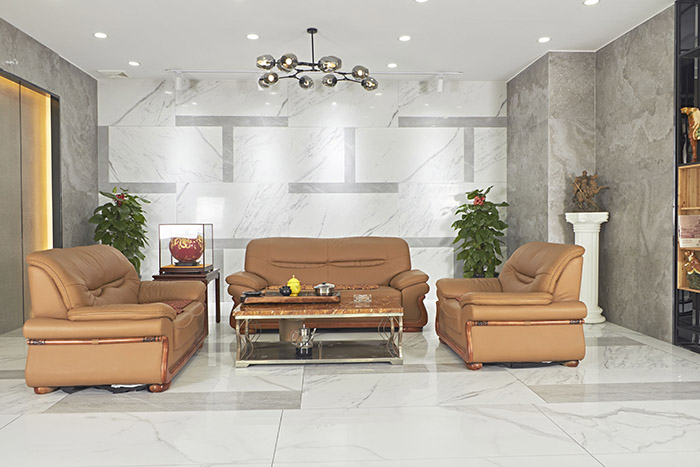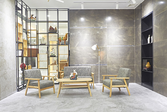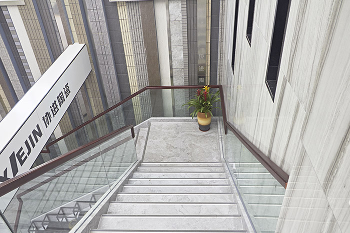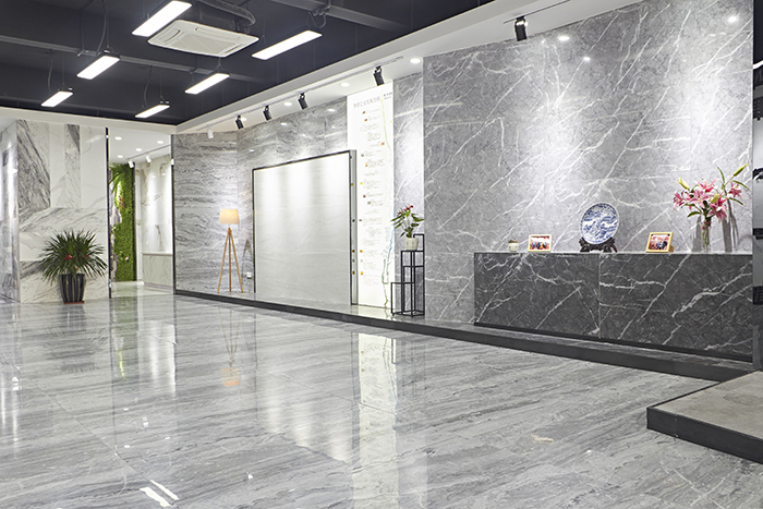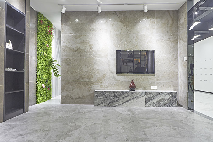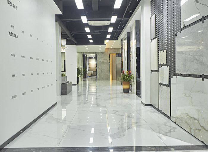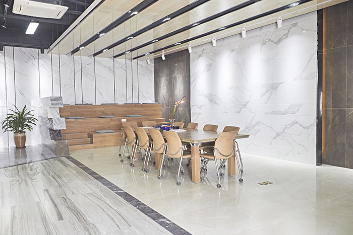 展廳使用 750*1500MM最新規(guī)格簡約大理石產(chǎn)品 與600*1200MM薄型陶瓷板鋪貼裝飾 整體效果簡約現(xiàn)代不拘一格